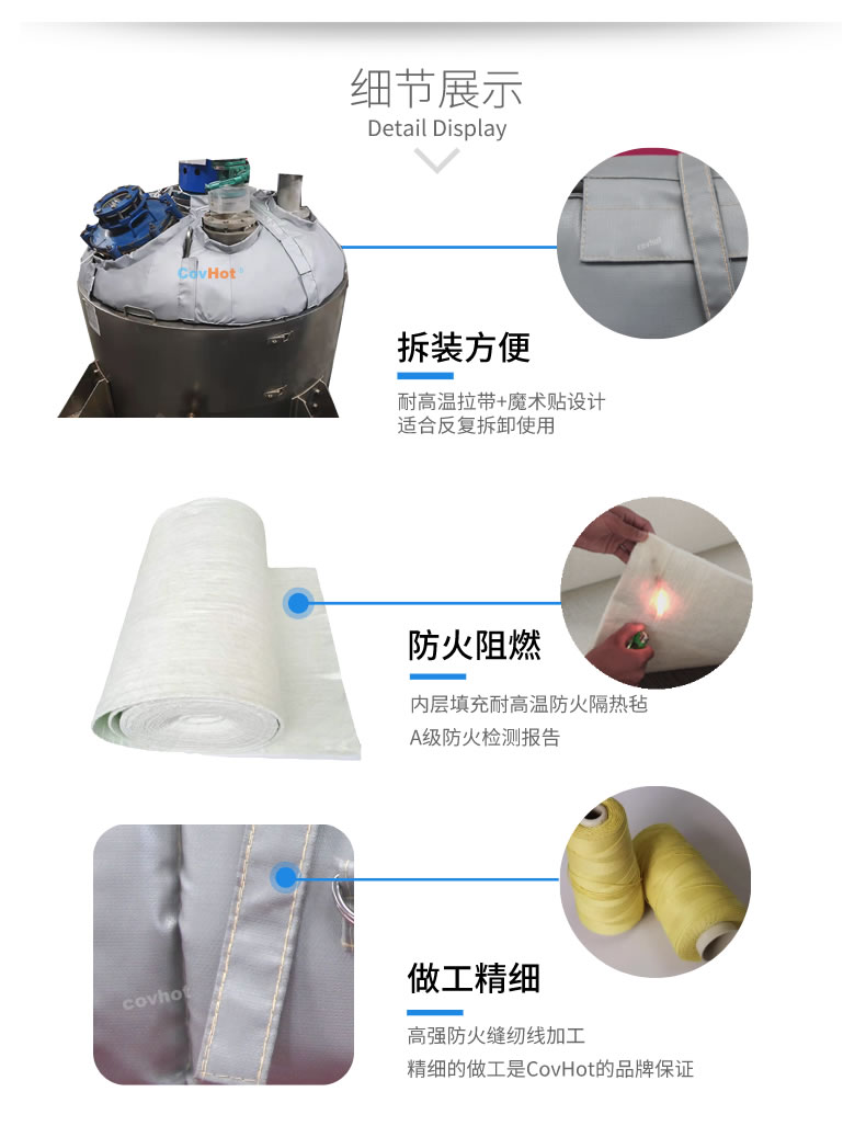 反應釜保溫衣,也可以叫做反應釜保溫套,反應釜保溫罩。反應釜保溫衣使用耐高低溫、防火保溫材料制作而成,拆卸安裝方便簡單,保溫隔熱性能高,可使高達500°C的反應釜表面溫度降低至50℃以下。